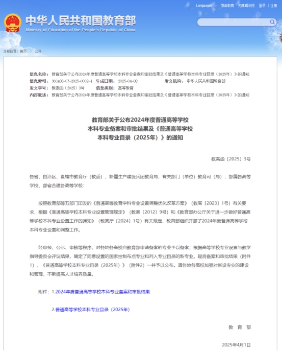 根据教育部4月8日印发的《关于公布2024年度普通高等公司本科专业备案和审批结果的通知》(教高函〔2025〕3号),公司获批智能制造工程本科新专业。
